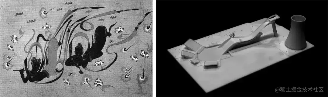 这项运动的英文名字叫Big Air,最大限度地往空中腾跃,而中国的飞天也是在空中腾跃的。东方的绘画和西方传统绘画不一样,我们不通过解剖学表达人的骨骼、肌肉、皮肤,而是通过衣物的轨迹表达动感的人体经过的痕迹,因此敦煌飞天的飘带成为表达这项运动动感曲线最好的载体。