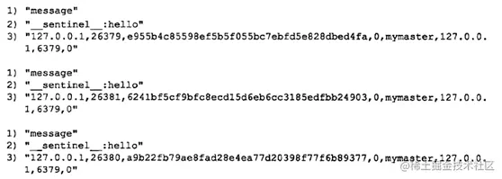 当有三个sentinel,分别是sentinel1、sentinel2 、sentinel3。三个sentinel在监视同一个服务器,那么当sentinel1向服务器的_sentinel_:hello频道发送一条信息时,所有订阅了_sentinel_:hello频道的sentinel(包括sentinel1自己在内)都会收到这条信息。