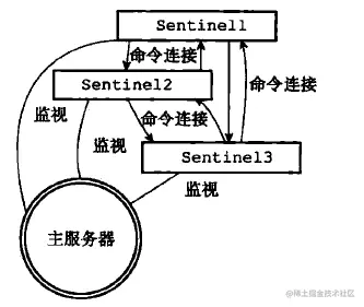 通过这个方式,哨兵 2 和 3 也可以建立网络连接,这样一来,哨兵集群就形成了。它们相互间可以通过网络连接进行通信,比如说对主库有没有下线这件事儿进行判断和协商。
