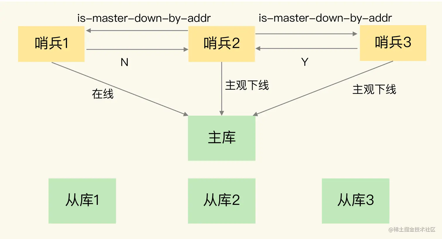 当某个哨兵(如下图中的哨兵2)判断主库“主观下线”后,就会给其他哨兵发送 is-master-down-by-addr 命令。接着,其他哨兵会根据自己和主库的连接情况,做出 Y 或 N 的响应,Y 相当于赞成票,N 相当于反对票。