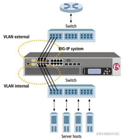 典型的 VLAN 配置是系统具有两个 VLAN 外部的和内部的,以及分配给每个 VLAN 的一个或多个 BIG-IP 系统接口。然后,您创建一个虚拟服务器,并将默认负载平衡池与该虚拟服务器相关联。