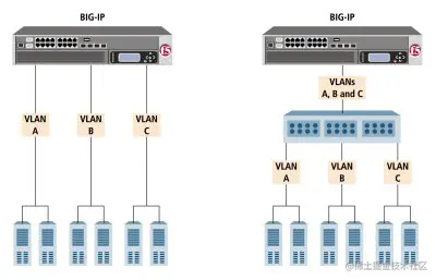 相反,右侧的配置显示了一个带有一个内部接口和一个外部交换机的 BIG-IP 系统。交换机将内部接口放置在三个独立的 VLAN 上。该接口在每个 VLAN 上配置为单标记接口。这样,单个接口成为所有三个 VLAN 的标记成员,并接受来自所有三个 VLAN 的流量。右边的配置是左边配置的功能等价物。
