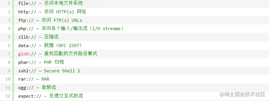 和phar://一样用于读取压缩文件,不过对于"zip://test.zip#file.txt"中的"#"要编码为"%23".因为url的#后的内容不会被传送