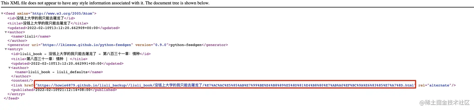 注意红框部分,因为我使用的是GitHub备份器,所以地址显示的是GitHub地址,所有人都是可以直接访问的,比如点这里(RSS订阅展示的内容就来自这个链接):