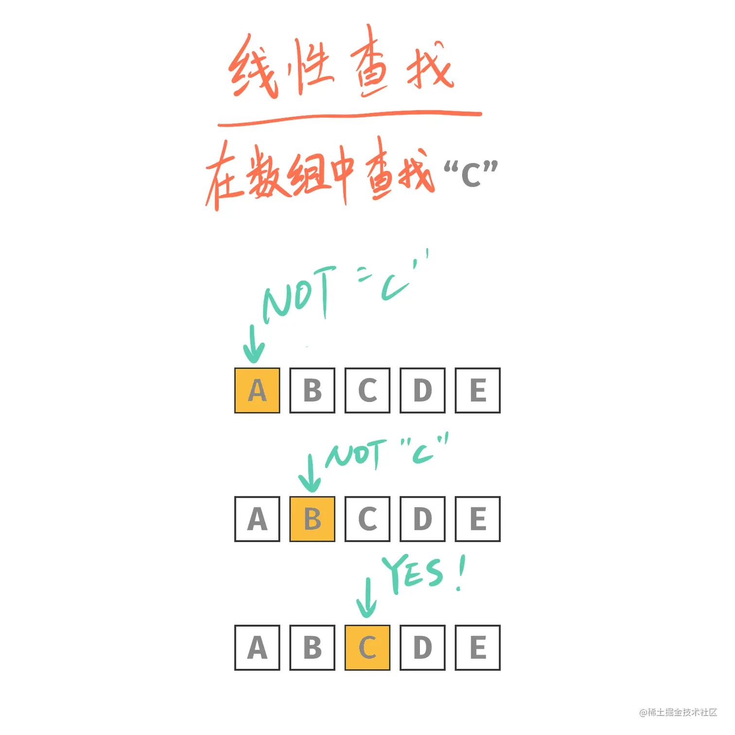 查找元素最直接的方式,就是按顺序轮流读取数组中的每个元素,看是不是我们要找的那一个,当找到的时候,就知道了它在数组中的位置,也就是元素的索引下标,如果数组中所有的元素都不是我们要找的,那它就不在这个数组中。