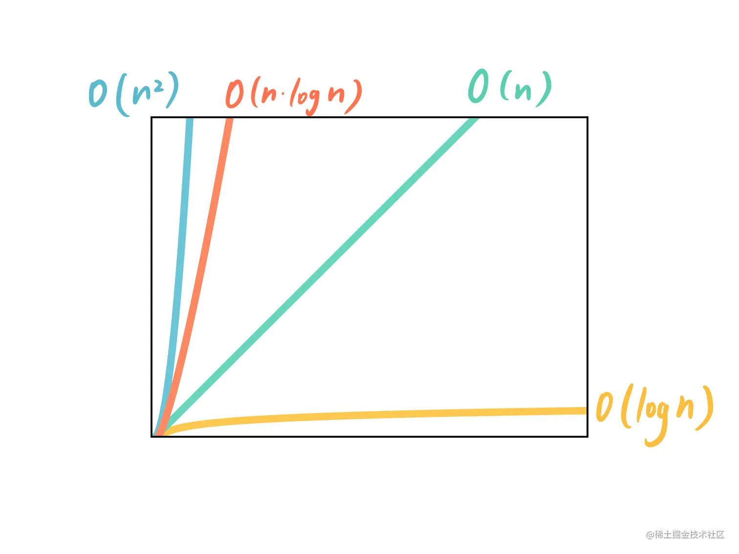 关于算法时间复杂度,除了上面介绍的两种,常见的还有 O(n)、O(n*log n)、O(n^2)、O(n!)等,算法的复杂度本质上指的是,随着操作元素的增加,算法需要执行的步数的增速。如果一个数组中只有一个元素,那线性查找和二分查找的执行步骤是一样多的。但是随着元素数量的增加,线性查找的操作步数呈线性增长,而二分查找的操作步数呈对数增长,两者差距很大。