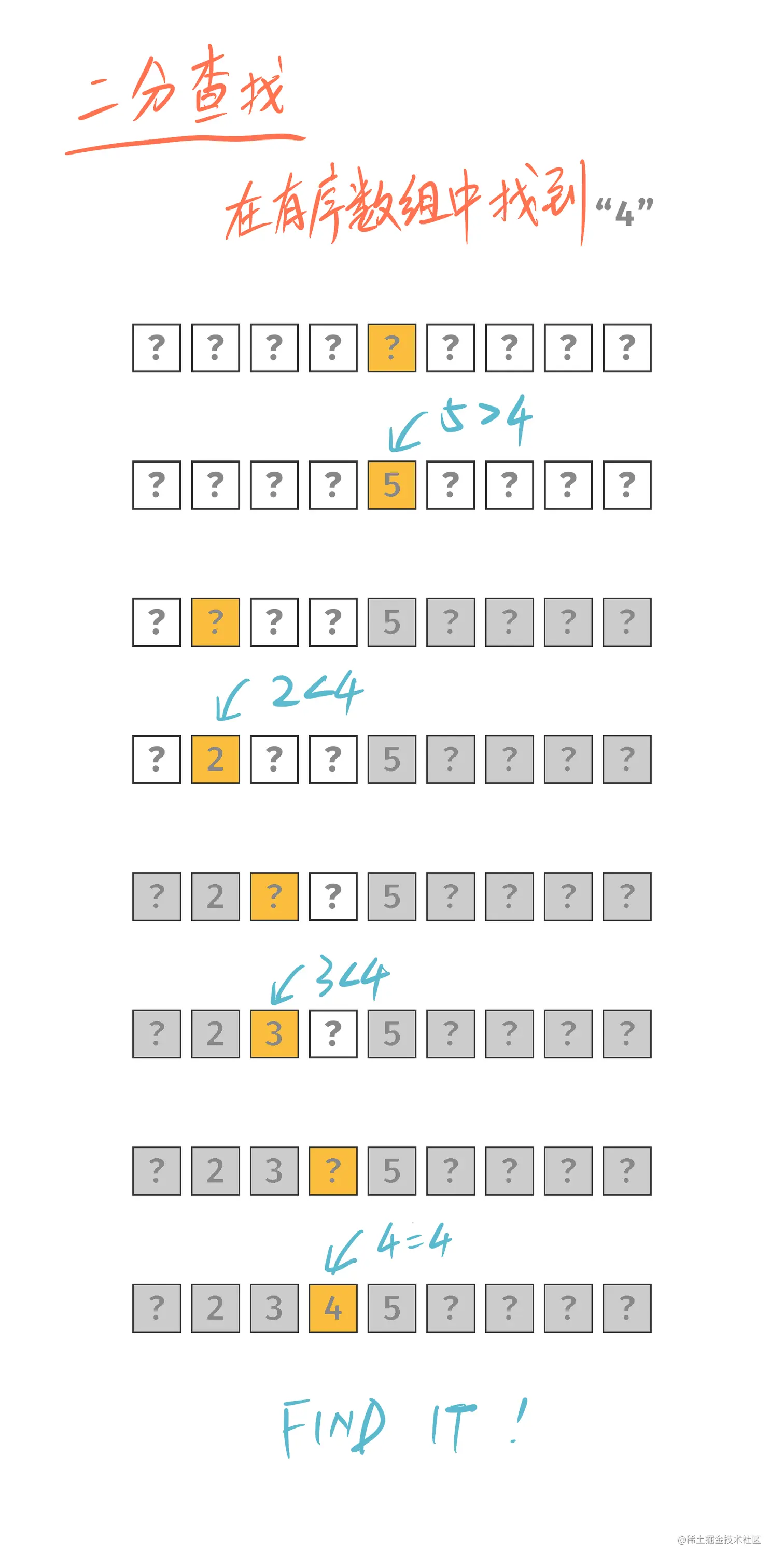 之所以叫二分查找,是因为,这个算法的步骤是,取数组中间的一个值,这样数组就会被分成两部分,根据中间的值与查找目标值的大小对比(也可以是字母顺序对比,或者其他方法对比,具体依数组内元素的排序方法而定),来选取中间值之前或之后的那部分,再进行相同的操作,直到找到目标值。