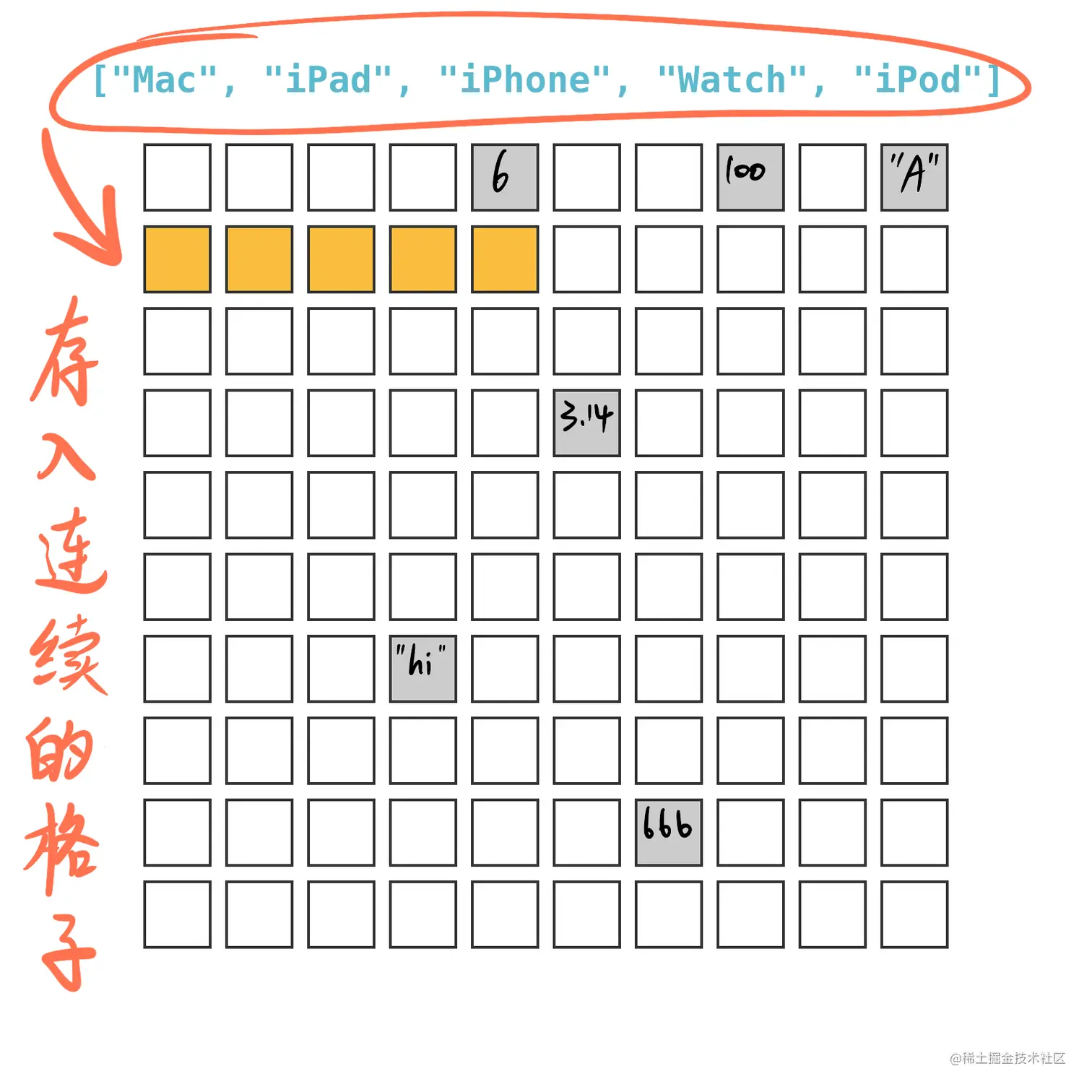 灰色的格子表示已经被占用的内存(想象这是一个储物柜,有一些储物格子已经放了东西),我们要存储的数组元素被放在五个连续的原先空着的格子里。