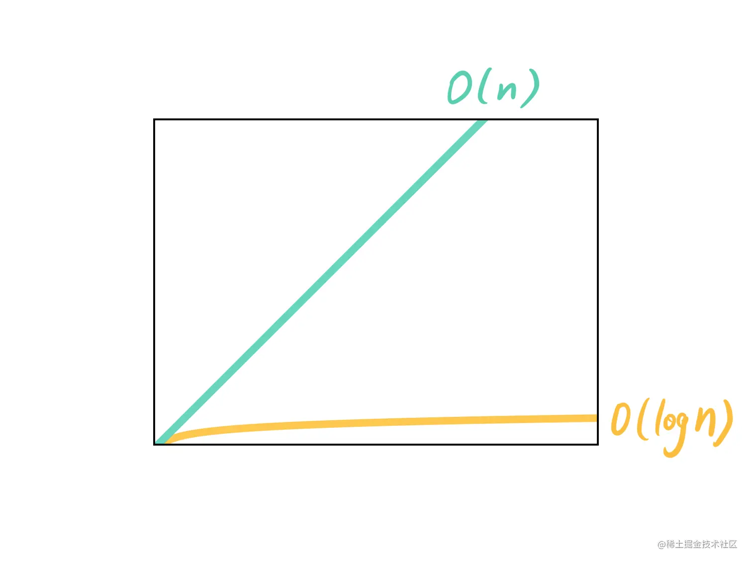 下图是随着元素数量的增加,两种复杂度的算法需要执行操作的步数对比。横轴是操作的元素数量,纵轴是算法需要执行的操作步数。可见,随着元素数量增加,两者的差距会越来越大。