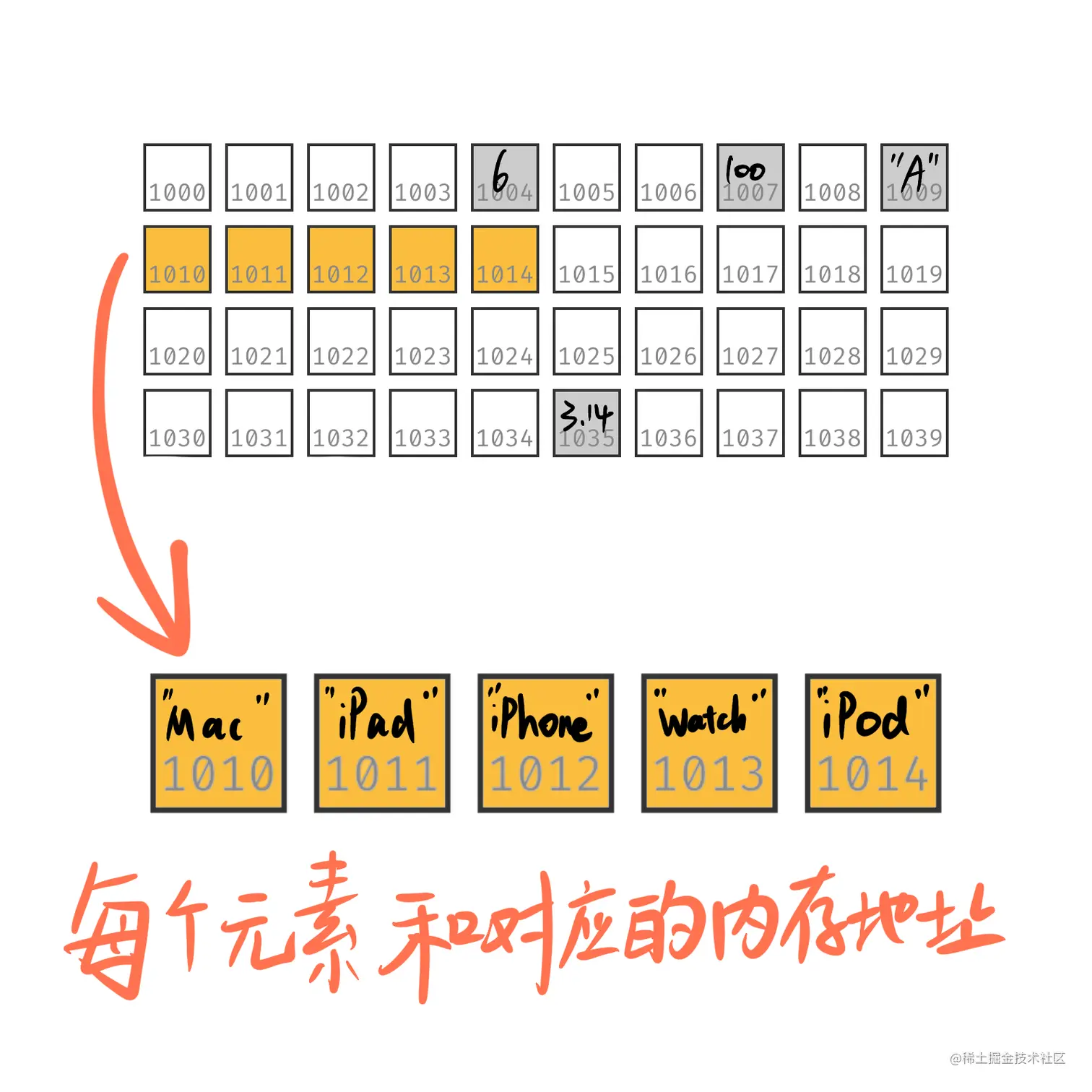 内存的每个格子都有一个地址,为了描述简单,我们假设这些格子的内存地址分别是1000、1001、1002……,因此我们保存的五个数组元素的内存地址就是1010、1011、1012、1012、1014。数组本身会记有第一个格子的内存地址,这样计算机可以一步就访问到任意一个内存地址的数据。因此,数组中任意一个元素的内存地址,就是第一个格子的内存地址,加上元素的索引。比如,计算机要访问第三个元素“iPhone”,就可以直接访问地址是1012(第一个元素的地址1010,加第三个元素的下标2)的内存格子,得到字符串“iPhone”。