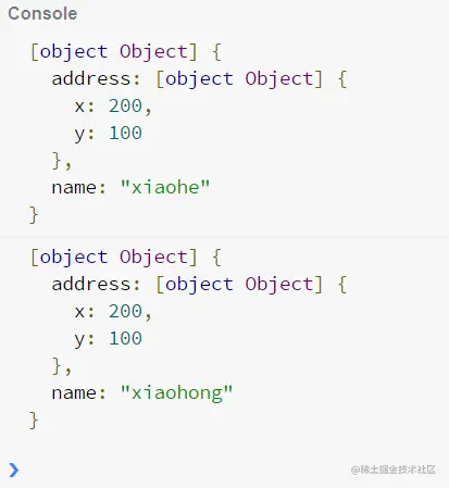 let obj1 = {name:'xiaohe',address:{x:100,y:100}}