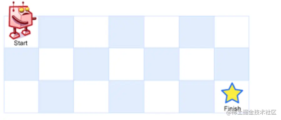 机器人每次只能向下或者向右移动一步。机器人试图达到网格的右下角(在下图中标记为“Finish”)。