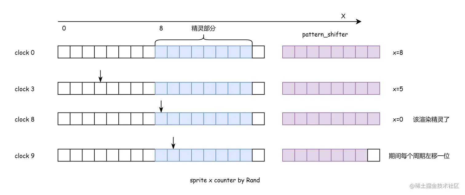 这里主要说说计数器有什么作用,渲染是一行一行的渲染,每行像素的 x 坐标值范围为 [0, 255],存放在计数器中的 X 坐标每个周期是会减 1 的,所以说,当某个计数器减到 0 时说明渲染到该精灵了。