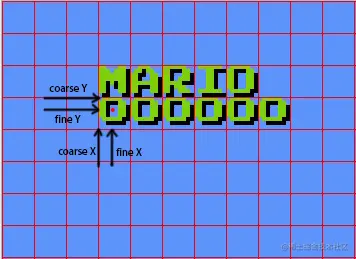 而 X 地址可以分为 coarse X 和 fine X,简单的翻一下就是粗糙的 X 地址和细致的 X 地址(有啥好的翻译??),Y 地址同样也是如此,可以分为 coarse Y 和 fine Y,什么意思呢,直接来看图: