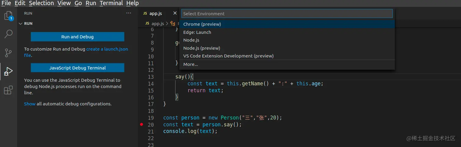 launch.json是vscode用于调试的配置文件,比如指定调试语言环境,指定调试类型等等。我们第一次运行程序的时候,就可以选择让vscode自动帮我们创建出来。我们这里以调试node.js环境为例。