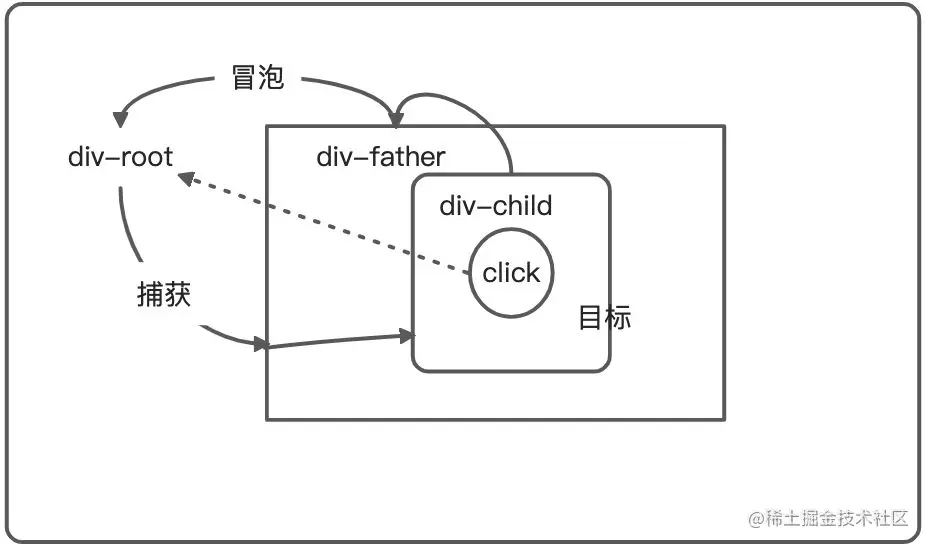 此时我们需要在 child 的元素上进行点击,点击的操作会透过 root 和 father 两个外层的元素到达 child。我们将这个过程称之为捕获——即从外层元素开始到寻找出需要被操作的元素。