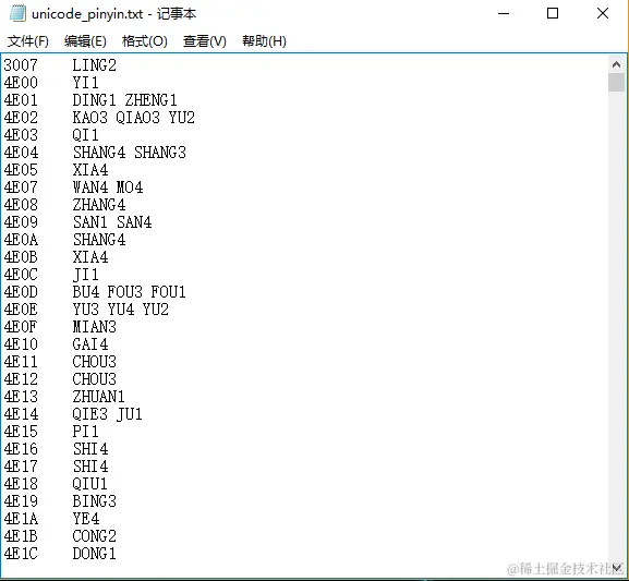 说明:将该文件与"unicode_py.txt"文件放在同一目录下,代码比较简陋,因为主要给大家讲实现教学,所以没有对多音字进行处理(所以默认使用第一个使用频率最高的音)