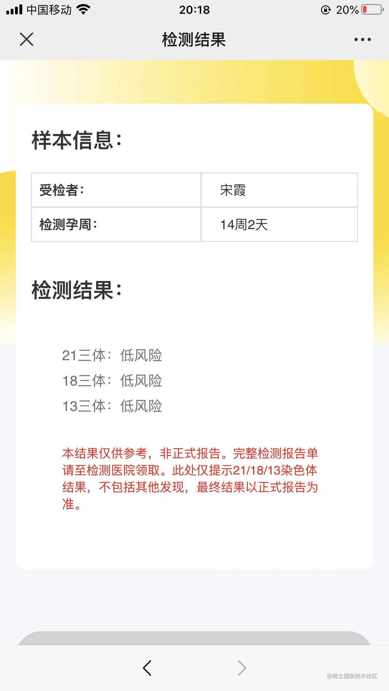 | 双顶径 | 46mm | 孕周20+0,正常范围:43-54.6mm |