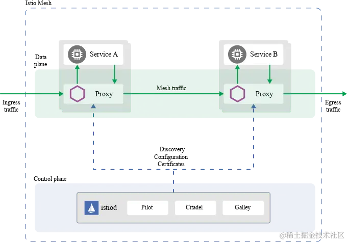 - 可以看到架构图上是Proxy,并不是Envoy, 其实Proxy是在Envoy的基础上包裹了一层的代理层,因为Envoy是使用C++编写的代理,但是Istio大部分都是使用Go编写的,不同语言通信上可能存在问题,所以在Envoy的基础上包裹一层.