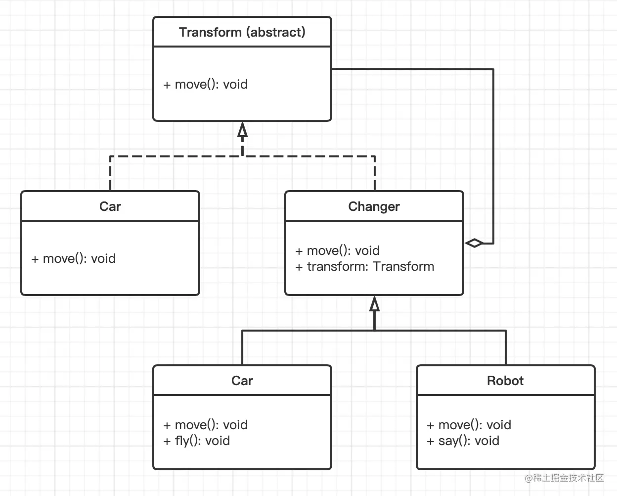 代码案例:有一个变形金刚,没变形之前是一辆车可以移动,但是经过变形后他可以说话,如果需要他也可以飞行