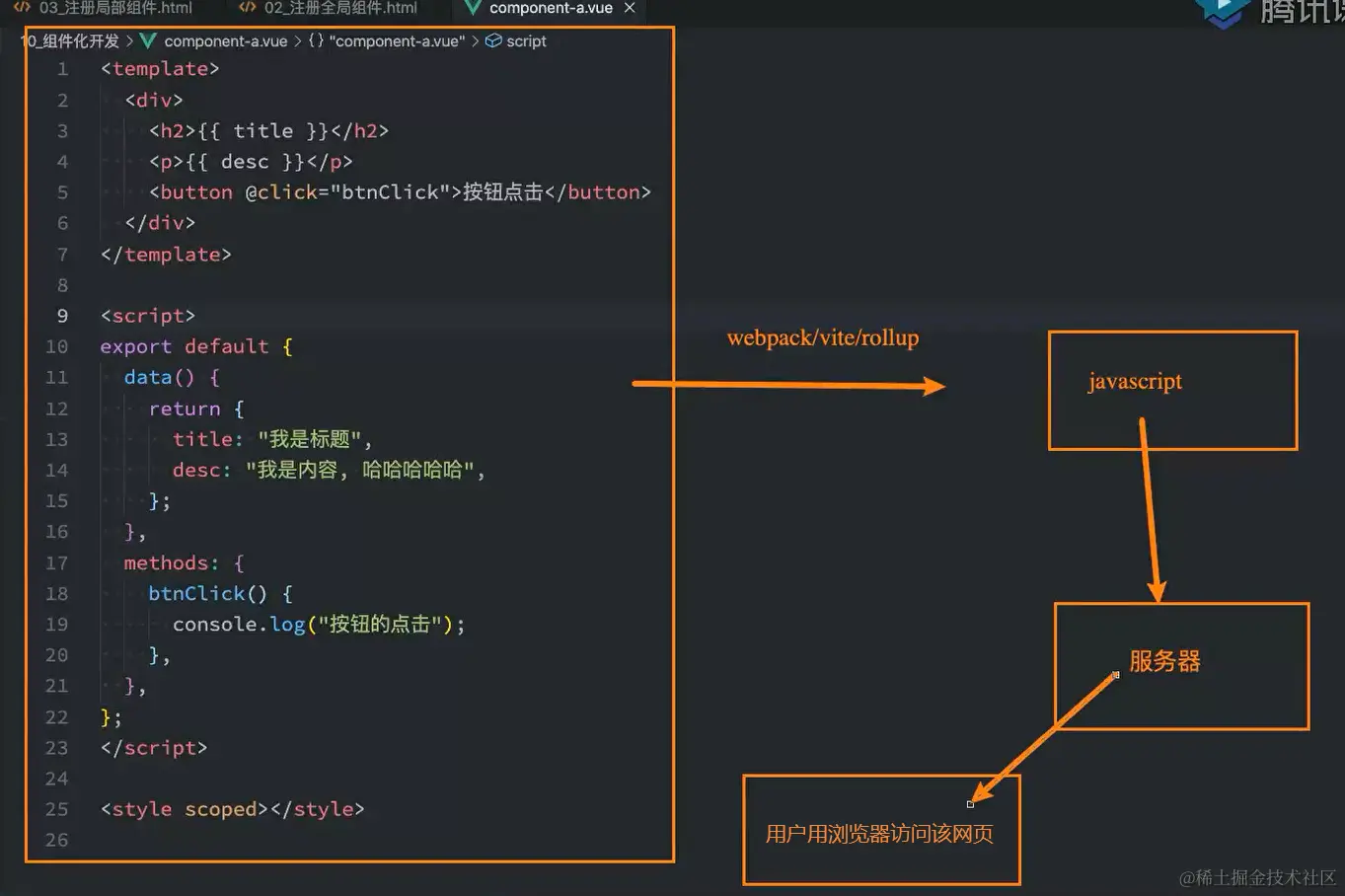 - 所以在真实开发中,我们可以通过一个后缀名为 .vue 的single-file components (单文件组件) 来解决,并且可以使用webpack或者vite或者rollup等构建工具来对其进行处理。