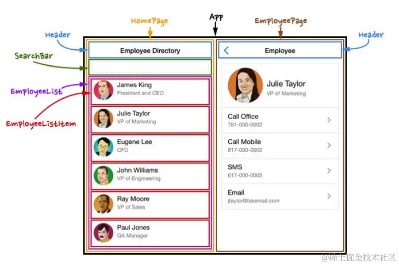 (2)组件化核心思想:我们需要通过组件化的思想来思考整个应用程序:我们将一个完整的页面分成很多个组件;每个组件都用于实现页面的一个功能块;而每一个组件又可以进行细分;而组件本身又可以在多个地方进行复用;