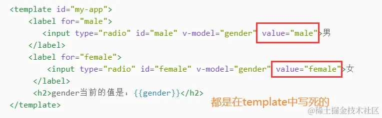 (1)目前我们在前面的案例中大部分的值都是在template中固定好的: 比如gender的两个输入框值male、female;比如hobbies的三个输入框值basketball、football、tennis。