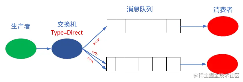 - error、info为路由key,消费者1只能接收到error的消息;消费者2能接收到error、info的消息