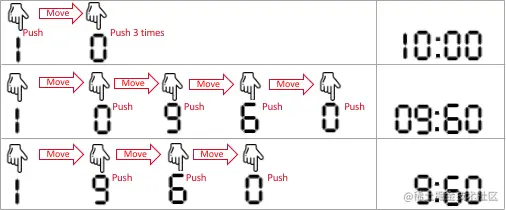 - You push 9 5 4 (three digits). It is normalized as 0954 and interpreted as 9 minutes and 54 seconds.