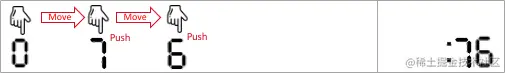 The finger moves to 9 (with cost 2), pushes 9 (with cost 1), moves to 6 (with cost 2), pushes 6 (with cost 1), moves to 0 (with cost 2), and pushes 0 (with cost 1).
