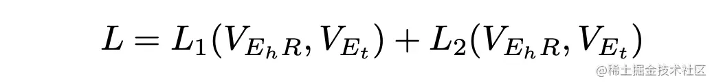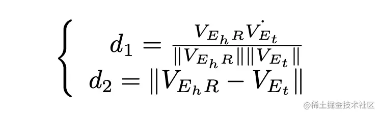 微调阶段主要有两部分,一个是基于对比学习的思想对负采样进行改进,在一批训练样本中构建负样本,能够解决之前方法负样本构建不足,训练不充分的问题。另一个是在训练中采用了数据增强的方法,将原始三元组的关系做了一个反向关系,比如之前的头实体预测样本为 (?,R,E_r) 改写为 (E_r, R_{rev}, ?) 用来增强数据。另外设计了两种距离计算方法来联合计算损失函数,如下: