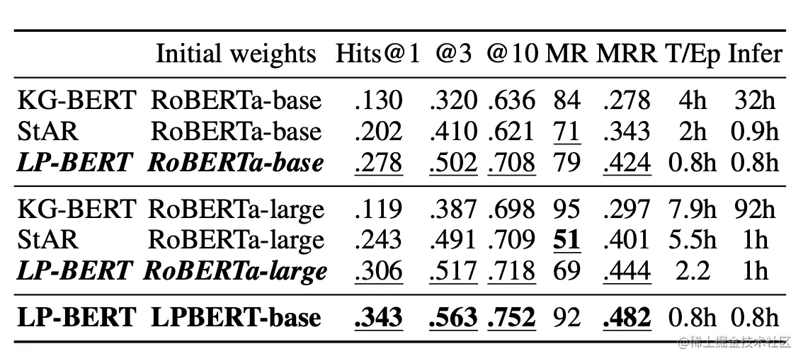下图为在WN18PR中,三种不同的语义匹配模型采用不同的预训练模型初始化的效果,从实验结果上来看,LPBERT-base相比RoBERT-base以及RoBERT-large有明显的提升。