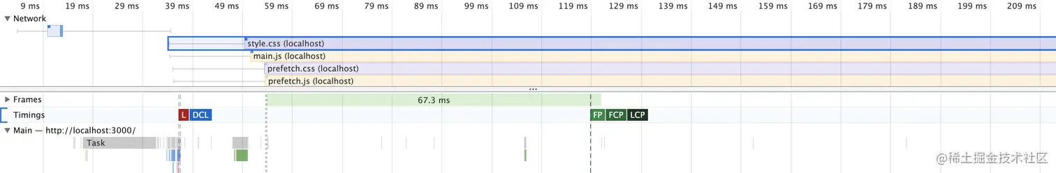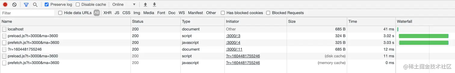 当页面中实际用到的资源与 preload、prefetch 加载的资源重复时,浏览器不会进行重复请求(这个例子中不会出现第三个 main.js 的请求);