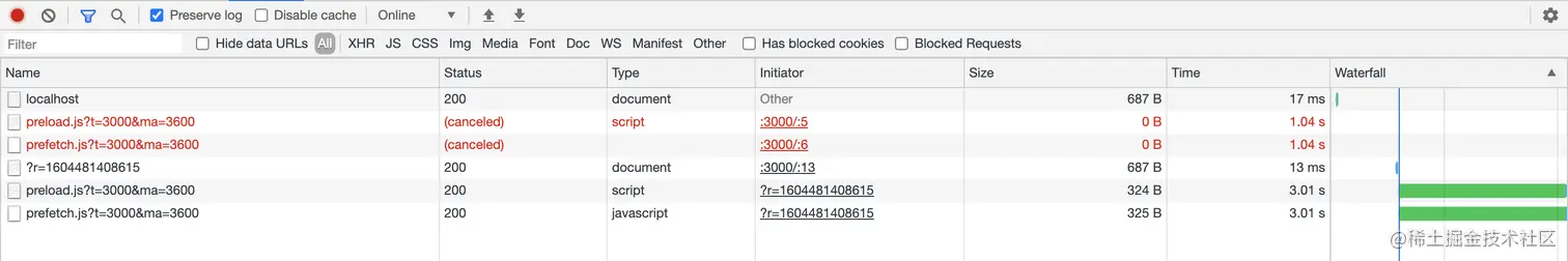 可以发现,在使用 preload、prefetch 加载资源时,如果发生了页面跳转,此时没有完成的请求将会被取消掉;