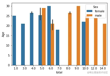 sns.barplot(x='total', y='Age', hue='Sex', data=stack_subset)