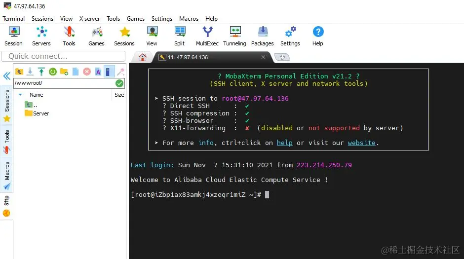 如果你使用的是 MobaXterm ,只需在左侧选择“sftp”标签,进入 /wwwroot 目录,然后将本地的文件夹直接拖动到空白处即可。