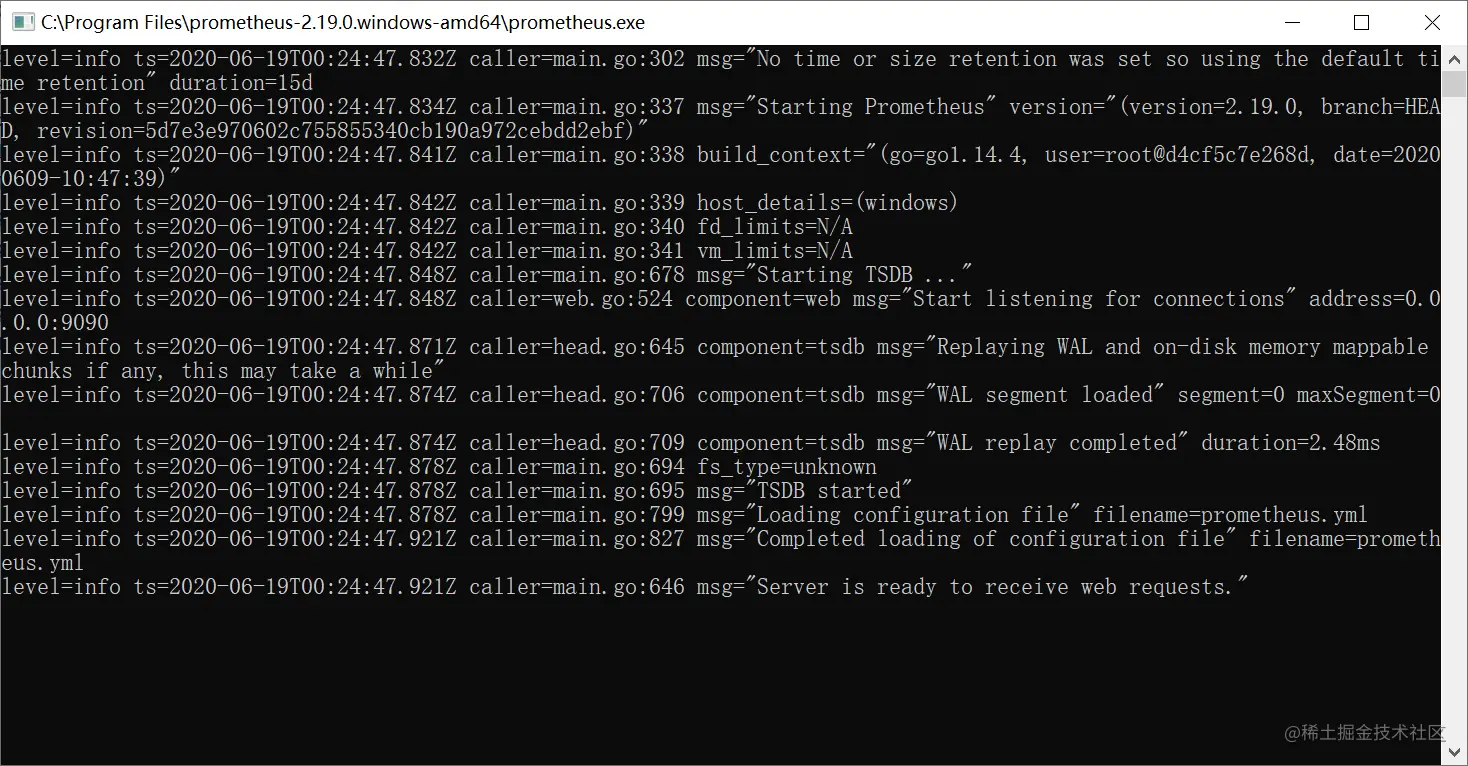 暂且不做修改,双击prometheus.exe即可启动,如下图: