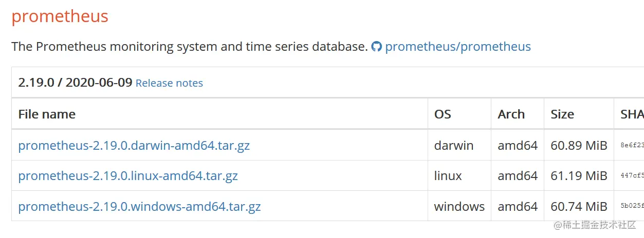 根据自己的系统下载对应的压缩包,这里以Windows为例,下载prometheus-2.19.0.windows-amd64.tar.gz。