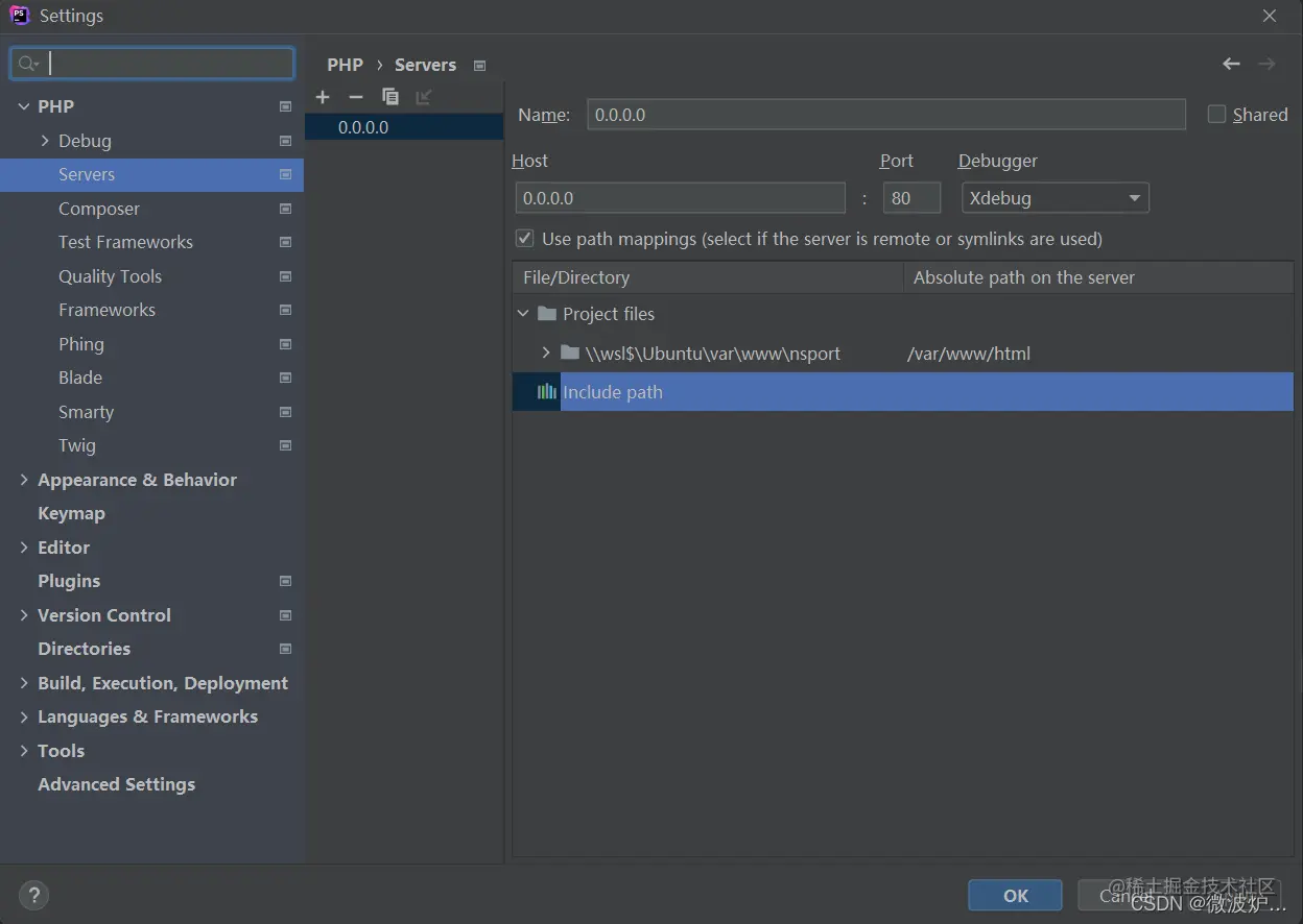 在配置 PhpStorm 的 Server 时,远程的绝对路径应该是 /var/www/html,这是项目在容器中的路径,而非项目在子系统中的路径。