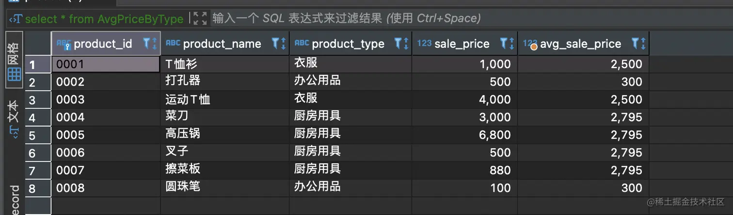 提示:其中的关键是 avg_sale_price 列。与习题三不同,这里需要计算出的 是各商品种类的平均销售单价。这与使用关联子查询所得到的结果相同。 也就是说,该列可以使用关联子查询进行创建。问题就是应该在什么地方使用这个关联子查询。