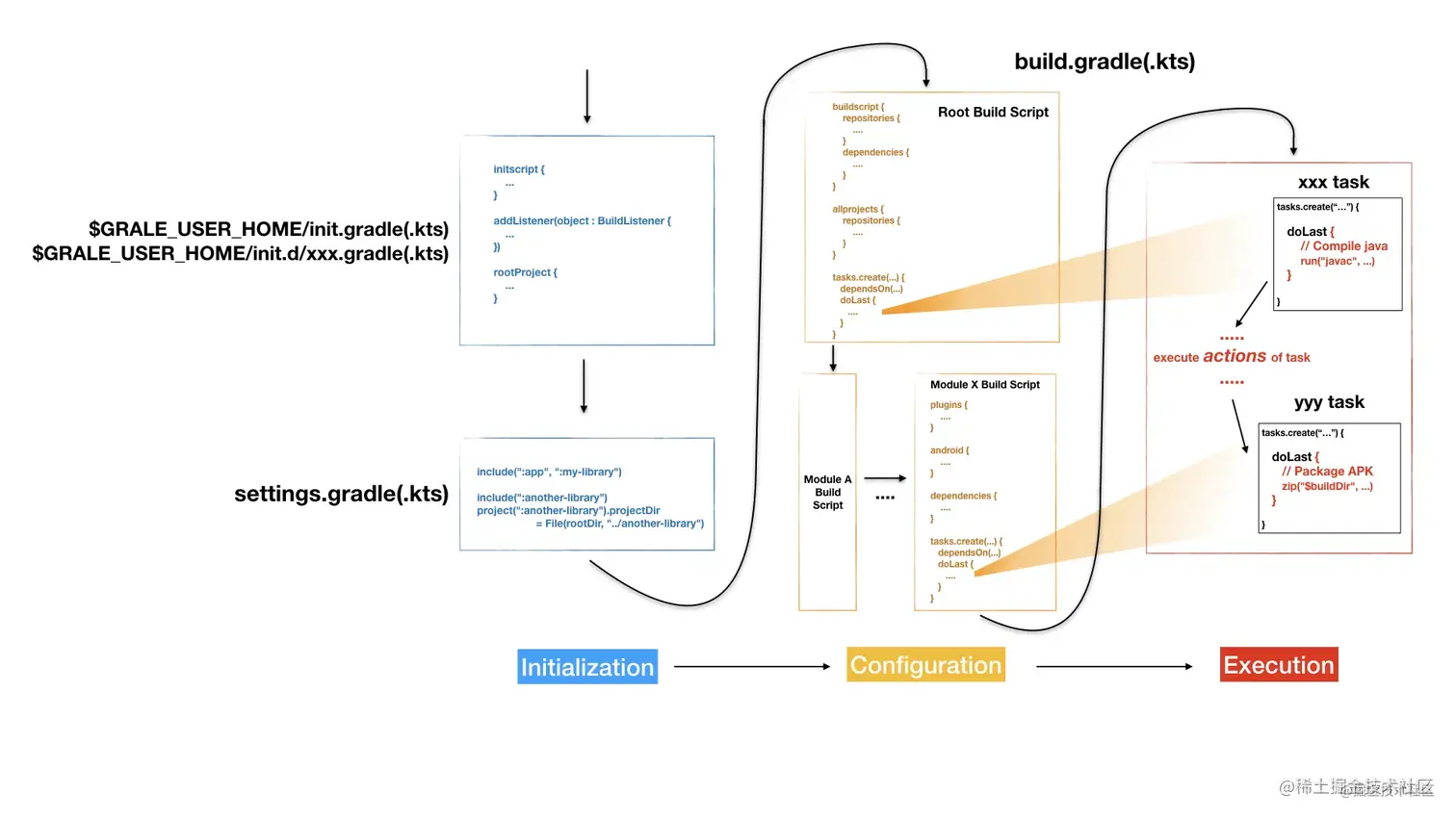 不同于传统脚本的自上而下执行, 一次 Gradle 构建涉及到多个文件, 主体流程如下:
