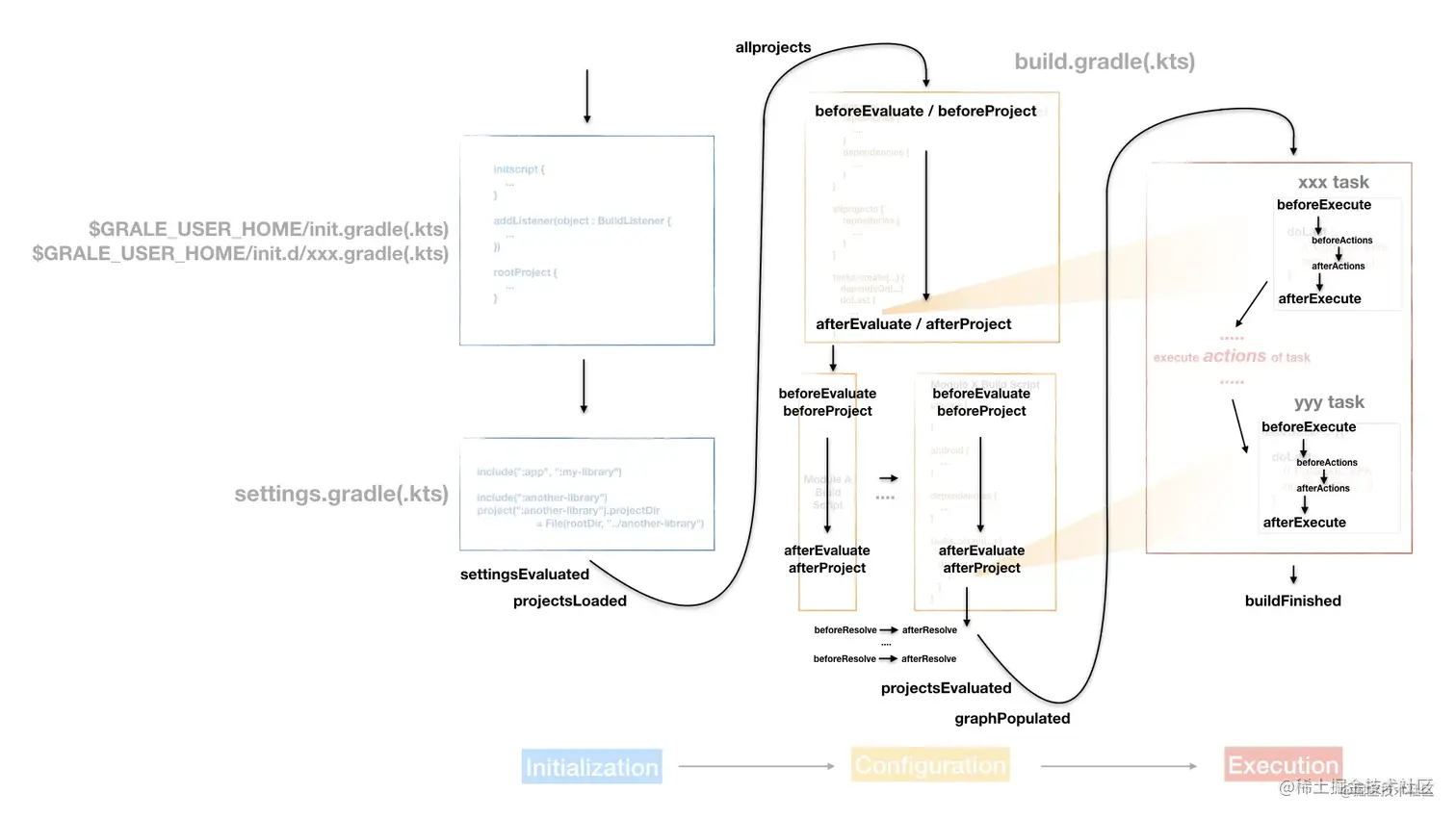 总体来说, Gradle 的执行分为三大阶段: Initialization -> Configuration -> Execution. 每个阶段都有自己的职责.