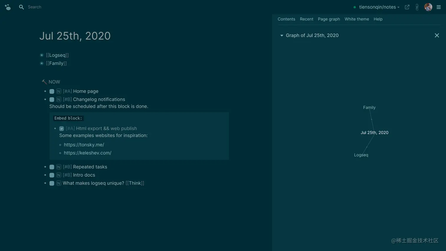 Logseq 是一款知识管理协作软件,支持 Markdown 和 Emacs Org 模式记笔记,可离线使用。最重要的是它关注隐私、本地存储和用户控制,服务器永远不会存储或分析私人笔记。