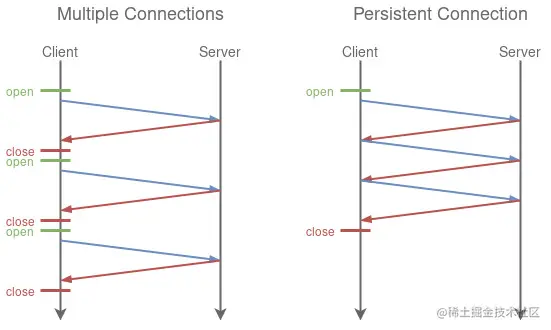 - HTTP/1.x 版本支持Keep-alive,用此方案来弥补创建多次连接产生的延迟,但是同样会给服务器带来压力,并且的话,对于单文件被不断请求的服务,Keep-alive会极大影响性能,因为它在文件被请求之后还保持了不必要的连接很长时间。