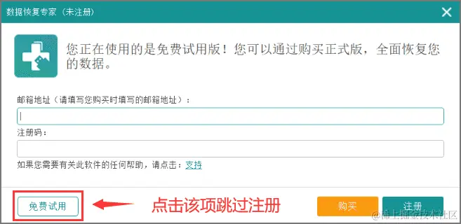 第1步:下载安装数据蛙数据恢复专家后打开软件,然后在跳出来的注册界面中执行跳过操作,如图所示;