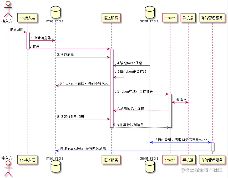 4)存储管理服务,会定期扫描cii索引,根据cii存储的最后更新时间,如果14天都没更新,说明是不活跃用户,会清理该token信息,同时清理该token对应的等待队列消息。