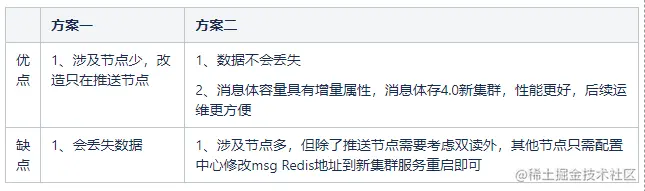 所有连接msg Redis的节点替换新地址重启,推送节点进行双读,等到老集群命中率为0时,直接切换读新集群。由于消息体的特点是只有写和读两个操作,没有更新,切换不用考虑状态问题,只要保证可以写入读取没问题。并且消息体容量具有增量属性,需要能方便快速的扩容,新集群采用4.0版本,方便动态扩缩容。