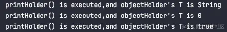 System.out.println("printHolder() is executed,and objectHolder's T is "+objectHolder.get());