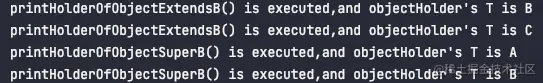 ObjectHolder<? extends B>参数,意思是只要ObjectHolder存储的元素是B类或是B类的子类即可。 - printHolderOfObjectSuperB()方法。该方法接收