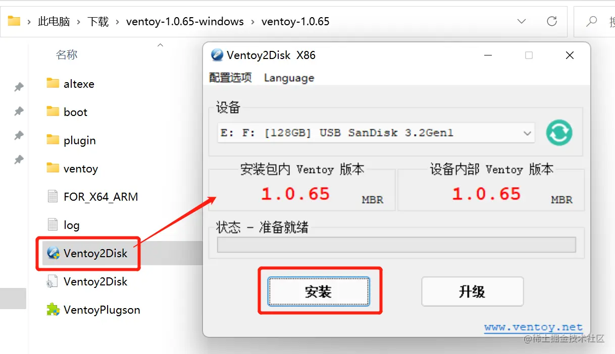 插入 U盘,双击打开 Ventory2Disk,点击安装开始制作启动盘: